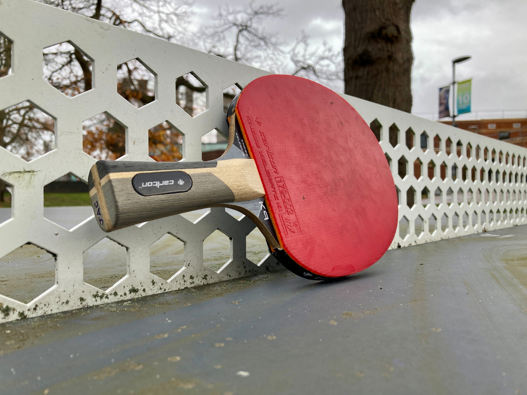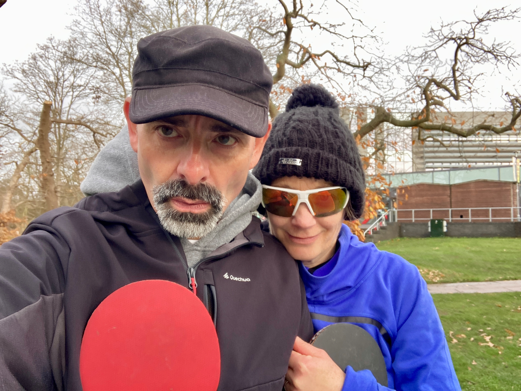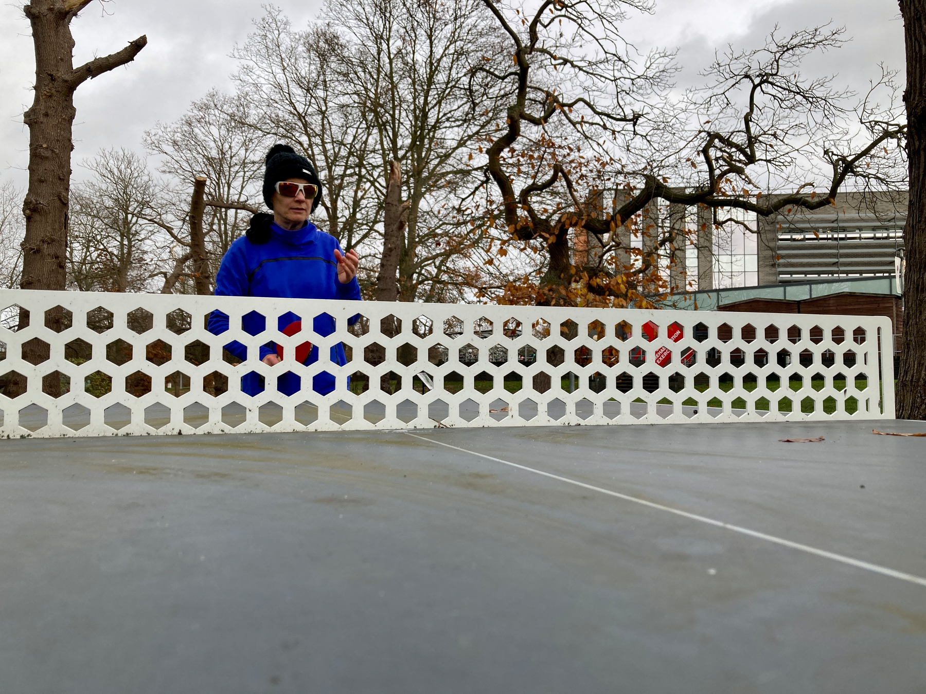 A cheeky Monday lunchtime game of table tennis at the University. We were up on campus for pickleball. We passed the outdoor table tennis tables. We had the bats and ball.