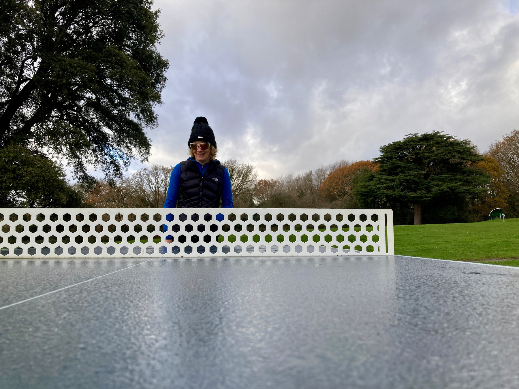 We also used the wind ball, with a light breeze blowing in. The combination of the unpredicatbale bounce becuase of the water, plus the wind, led to a most odd game of table tennis.